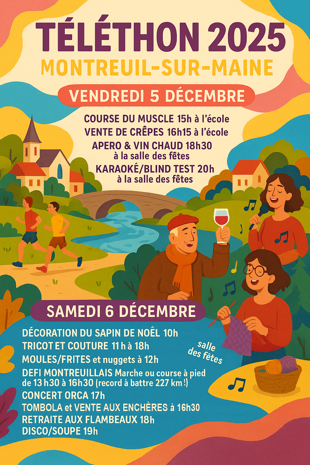 Le Comité des fêtes, les Associations et l'Ecole de Montreuil-sur-Maine organisent tout un programme afin de fédérer autour de cette belle action du TELETHON ! Venez nombreux ! Animations organisées à l'école et la salle des fêtes.