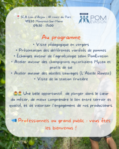 Cette journée, ouverte à tout les habitants de Montreuil et les visiteurs de la région, sera l’occasion de découvrir l’exploitation arboricole, ses méthodes de production innovantes, tout en participant à divers ateliers thématiques (biodiversité, innovation agricole, durabilité), et sera l’occasion d’échanger avec les producteurs.
